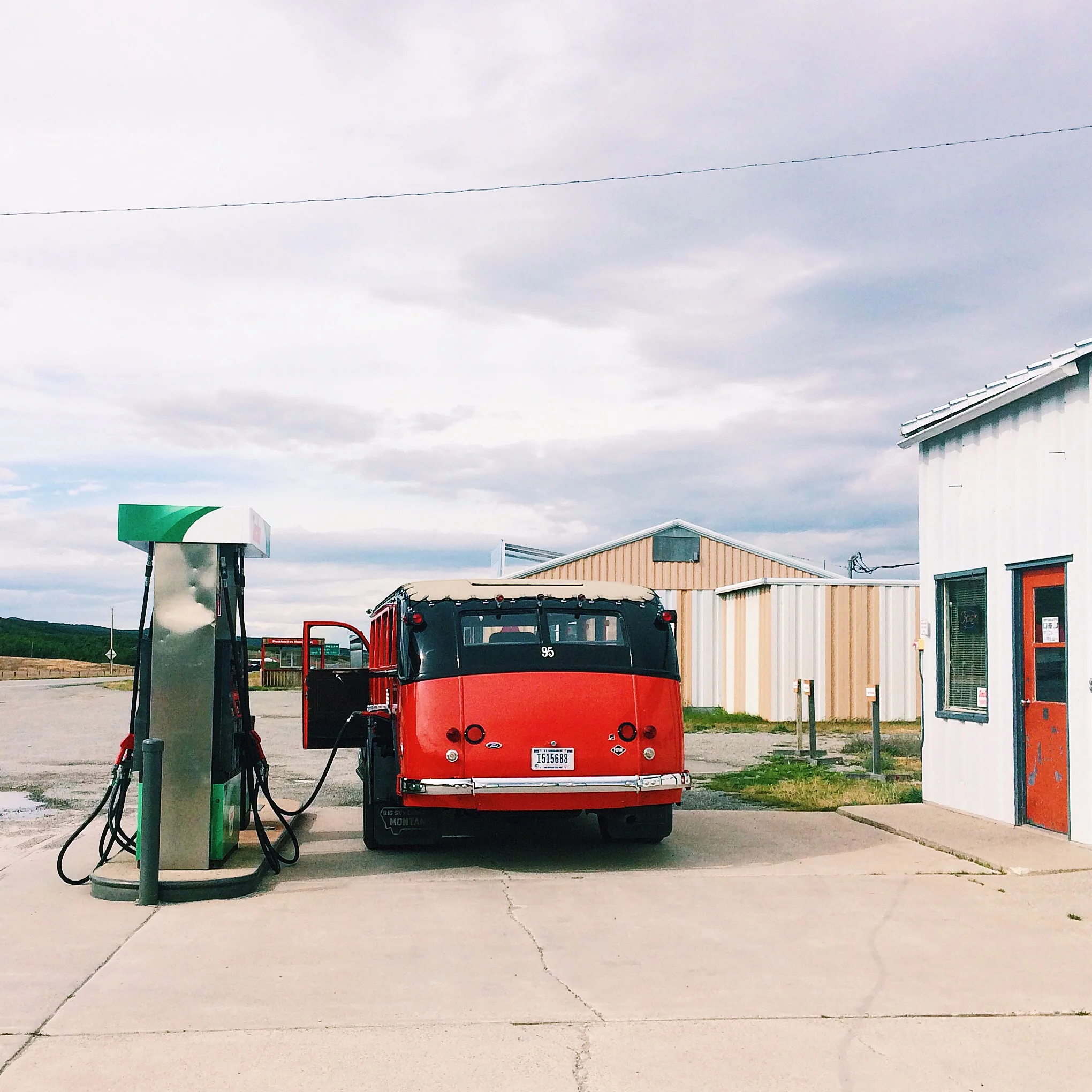 Red Jammer gassing up at Thronson's General Store in Babb, Montana